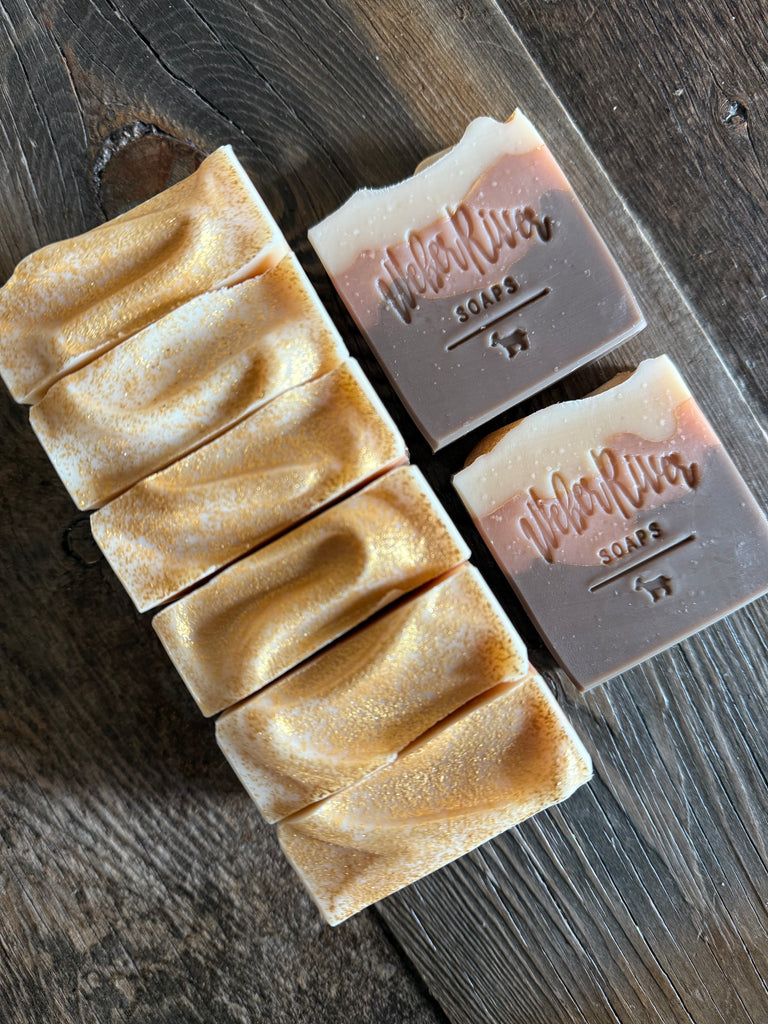 These are made with lovely oils, butters, and goat milk. They are colored with rose clay, mica, and zinc oxide. They are topped with gold mica dust. Scented with a phthalate free fragrance oil with notes of blueberry, white freesia, wild grape, pomegranate, lily, magnolia, green vines, cashmere, and violet.