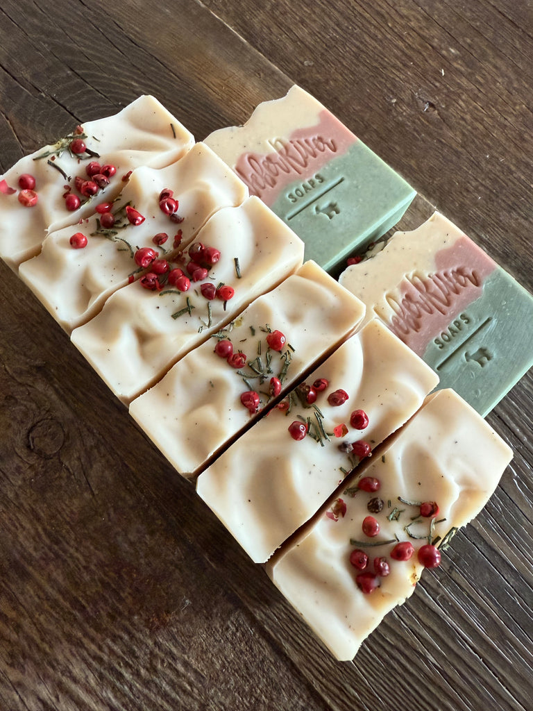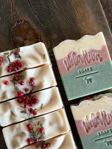 These cute soaps have a cabin in the woods during Christmas vibe to them in my opinion. They are scented with a blend of cedarwood atlas, palmrosa, scotch pine, fir needle, and dark patchouli essential oils. Colored with activated charcoal powder, green kaolin clay, spirulina powder, red Moroccan clay, vanilla bean powder, and zinc oxide. Topped with pink peppercorns and dried rosemary leaves.