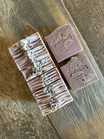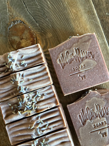 Ingredients: Coconut oil, shea butter, olive oil, rice bran oil, sweet almond oil. Sodium hydroxide, sodium lactate, goat milk, distilled water. Lavender, cedarwood, and vanilla oleoresin essential oils. Alkanet root powder, purple Brazilian clay, purple kaolin clay, ground vanilla bean powder, zinc oxide, and dried lavender buds.