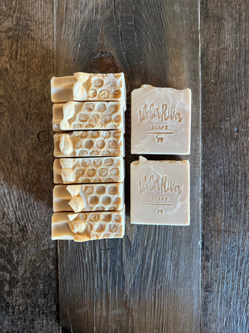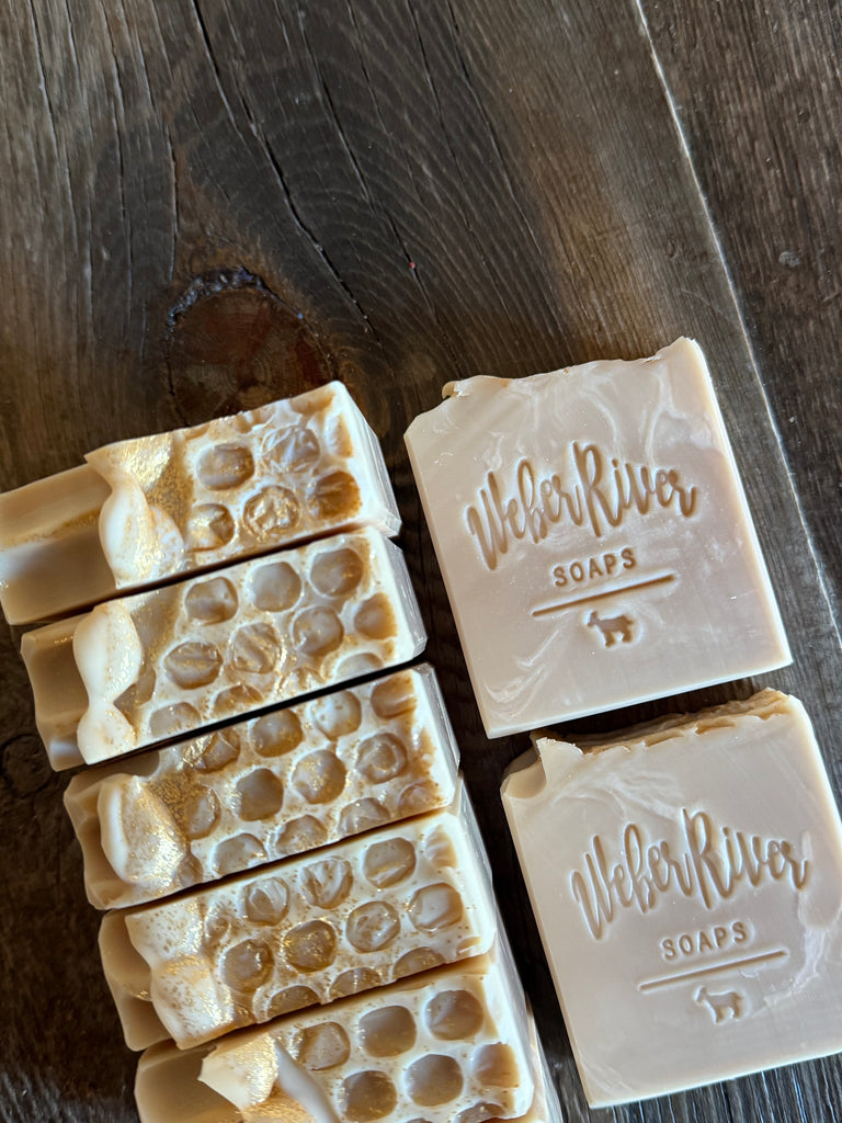 These popular bars have notes of warm milk, sweet honey, and rolled oats. They are so soothing and creamy. I always add colloidal (super finely ground) oats and honey! Topped with a gold mica and a honeycomb design.