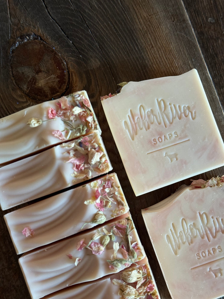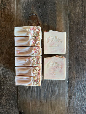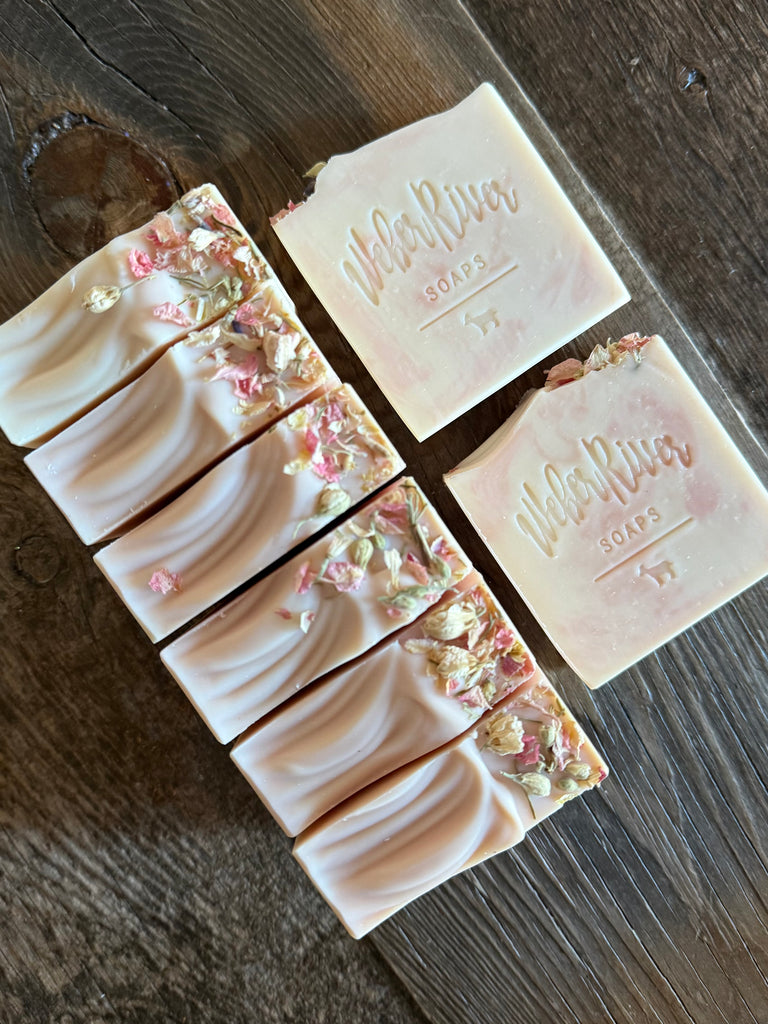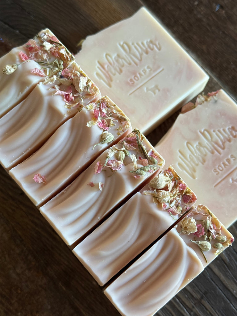 These beautiful soft pink and cream soaps have scent notes of sparkling cassis, bergamot, lemon, rhododendron, honey, peony, dandelion fields, and white musk. They are colored with zinc oxide and rose clay. Topped with dried pink botanical flower petals.