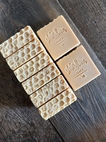 These lovely simple soaps are made with colloidal oats, honey, and bitter orange peel powder. They are scented with delicious blend of sweet orange and litsea cubeba (may chang) essential oils. Topped with a honeycomb design using bubble wrap. They are gentle and creamy!