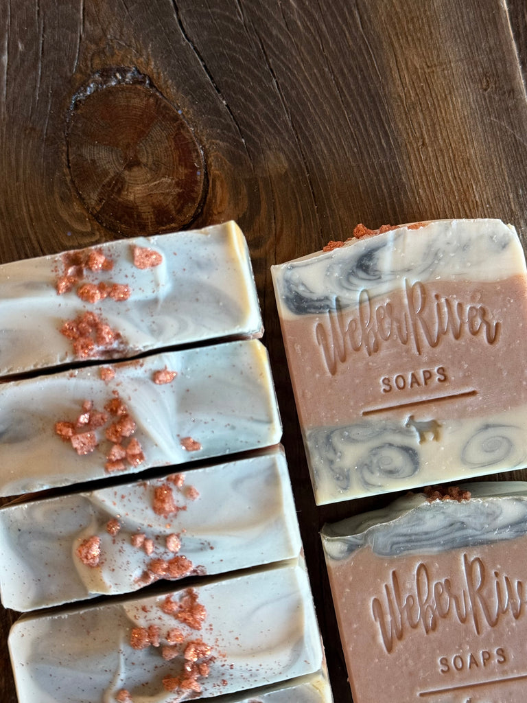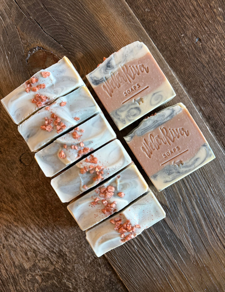 If you love woody and floral scents, this one is for you. It starts with notes of bergamot, olive, aloe blossom, pear, white lily, heliotrope, green tea, and rose, and finishes with notes of musk, sugared amber, and sandalwood. Colored with zinc oxide, activated charcoal powder, and mica. Topped with mica dusted sea salts.