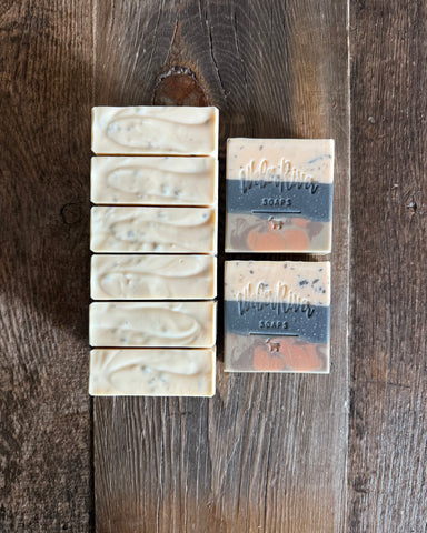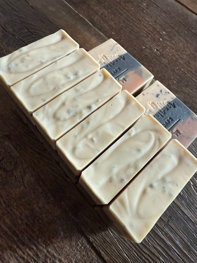 Ingredients: Coconut oil, shea butter, olive oil, rice bran oil, sweet almond oil. Sodium hydroxide, sodium lactate, goat milk, distilled water, phthalate free fragrance oil. Activated charcoal powder, mica, sea clay, zinc oxide, soap shreds (bentonite clay, lavender/peppermint/rosemary essential oils, lard, avocado oil, castor oil).