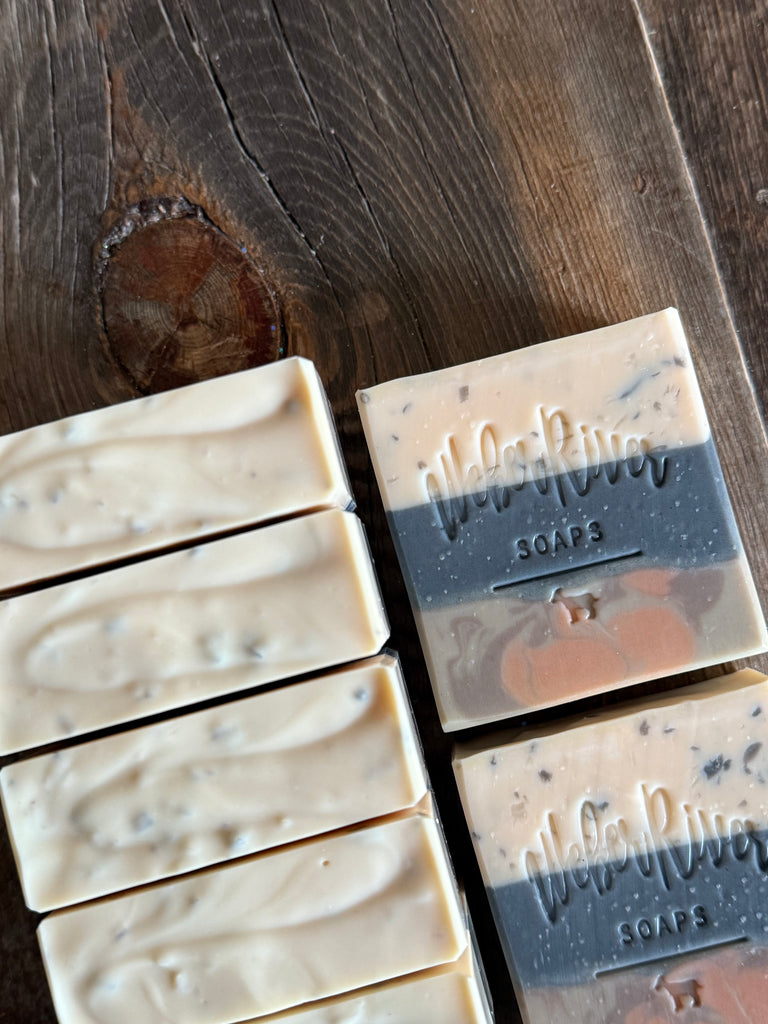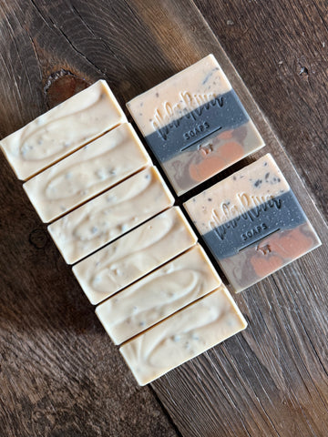 These soaps are colored with activated charcoal powder, sea clay, zinc oxide, and mica. They have notes of bergamot, leather, lavender, geranium, cypress, and sandalwood. It finishes with notes of suede, spiced musk, and tobacco. This is a very lovely masculine scent.